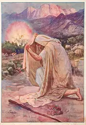 James Jacques Joseph Tissot. Public Domain Image from The Jewish Museum. | Tissot 26339-moses-adores-god-in-the-burning-bush-moise-adore-le-buisson-ardent TRADART PD.webp |