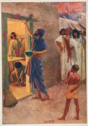 A man applying blood on his door posts as part of the origin of the passover ritual. Exodus 12. Bible Illustrations. AI-generated image using ChatGPT-4 / DALL-E 3. Prompt by Tor Tjeransen. | AME_100127351_DALL·E 2024-02-19 13.34.38 CC-BY Tor Tjeransen (AME-AI).jpg |