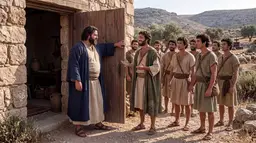 A Tense Encounter at Carmel Gates.David's hopeful messengers stand before a disdainful Nabal, whose dismissive posture hints at the gathering storm of conflict against the backdrop of the rugged Carmel landscape. CC0 Abigail de Bruyn.@AbiQueenie7 https://bibleworld.ai/image/ef849677-86e2-4c44-b8eb-9fcab9d0b21f | A Tense Encounter at Carmel Gates.BibleWorld.CC0.AbiQueenie7.webp |