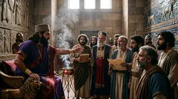 The Babylonian king stands before his trembling council of sorcerers and astrologers, demanding they reveal a vision lost to his own memory. The scene captures an atmosphere of intense tension and royal decree beneath the weight of ancient mystery. https://bibleworld.ai/image/39819ab1-f50b-4935-a90f-a54871916d5a | Nebuchadnezzar Demands The Forgotten Dream BibleWorld CC0 Rob.upsc.jpg |