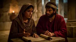MidJourney dmcfeeters_Biblical_woman_teachings_a_man_from_a_scroll_greco-r_0e3d24c3-7ddb-4b48-854e-5bedd52c8af1.webp