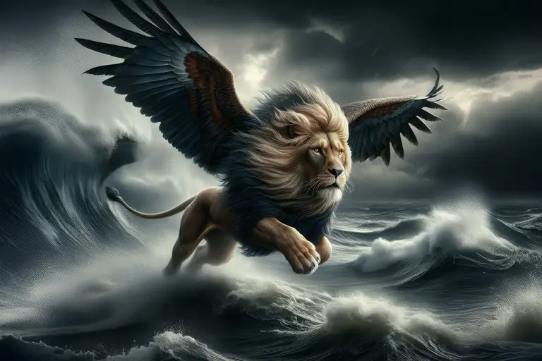 | Desc | The first beast. Lion with wings. The beasts of Daniel 7. Beasts of prophecy. Bible Illustrations. AI-generated image. |